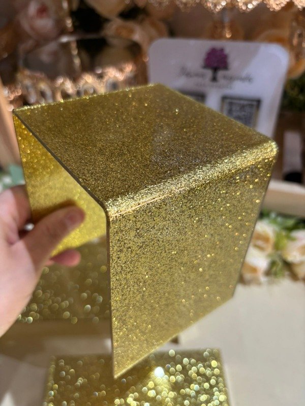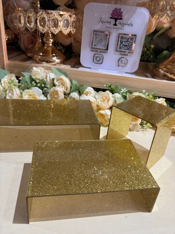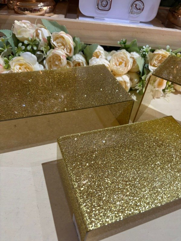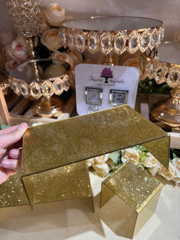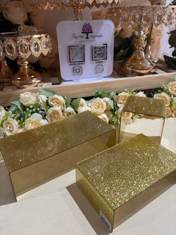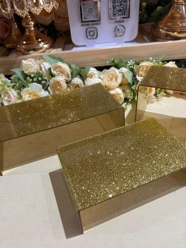 Trio de elevadores acrílicos glitter color dorado en tres medidas diferentes