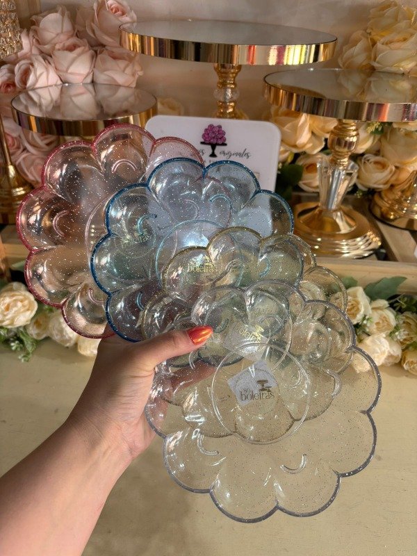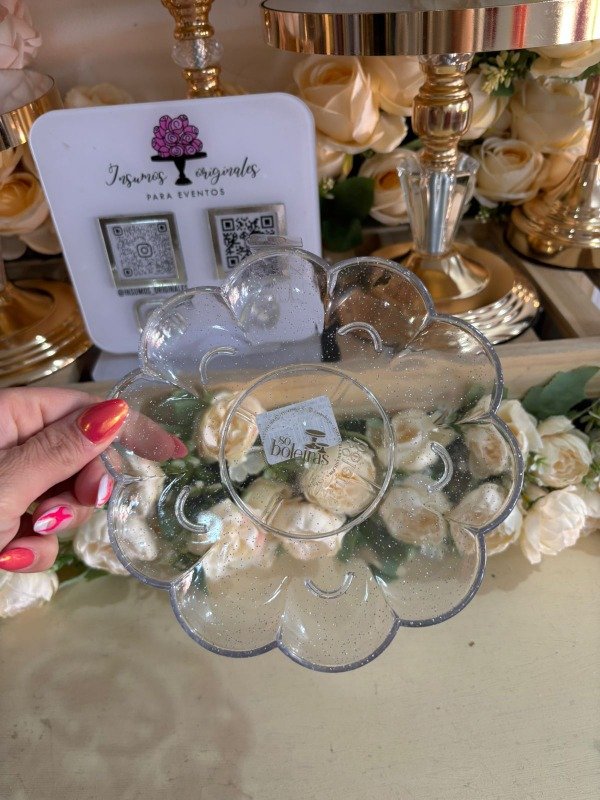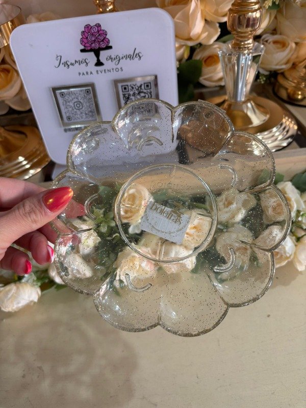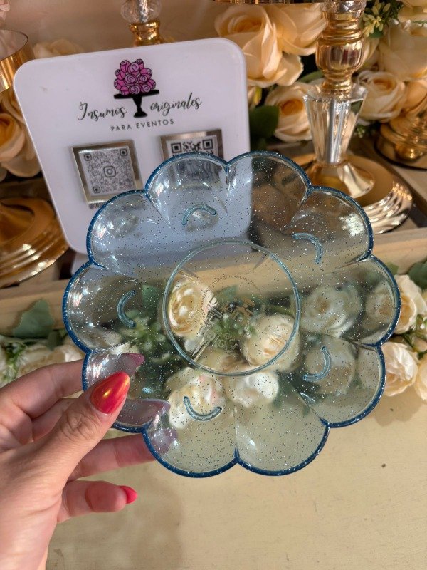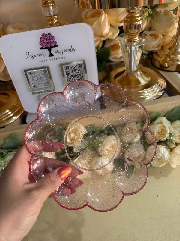 Bandeja en flor de flor con glitter . Mide 17.5cm de diámetro Sb